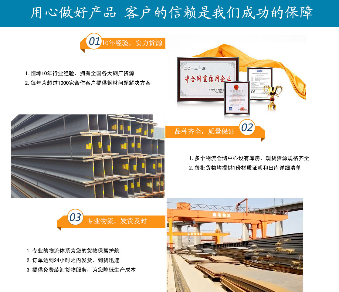 蘭州恒坤商貿(mào)有限公司立足于鋼材貿(mào)易,主要經(jīng)營:鋼板、角鋼、工字鋼、槽鋼、H型鋼、鍍鋅槽鋼、鍍鋅角鋼、鍍鋅板、鍍鋅卷、鍍鋅圓鋼、鍍鋅工字鋼多種型號鋼材產(chǎn)品。多年來,我公司始終堅(jiān)持質(zhì)量第一,信譽(yù)至上的經(jīng)營方針,與酒鋼、包鋼、八鋼、唐鋼、鞍鋼、萊鋼、兗礦、日照鋼鐵、濟(jì)鋼,成都、天津等多家企業(yè)達(dá)成大批量物資供應(yīng)協(xié)議,并且與省內(nèi)外多家客戶建立了合作關(guān)系。